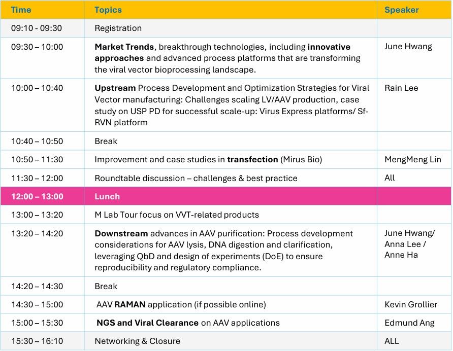 2025 Viral Vector Therapy Workshop。誠摯邀請您蒞臨 M LabTM Taiwan,與我們一同深入探討病毒載體的強大潛力—包括腺相關病毒 (AAV) 與慢病毒 (LV) 兩種常見平台。