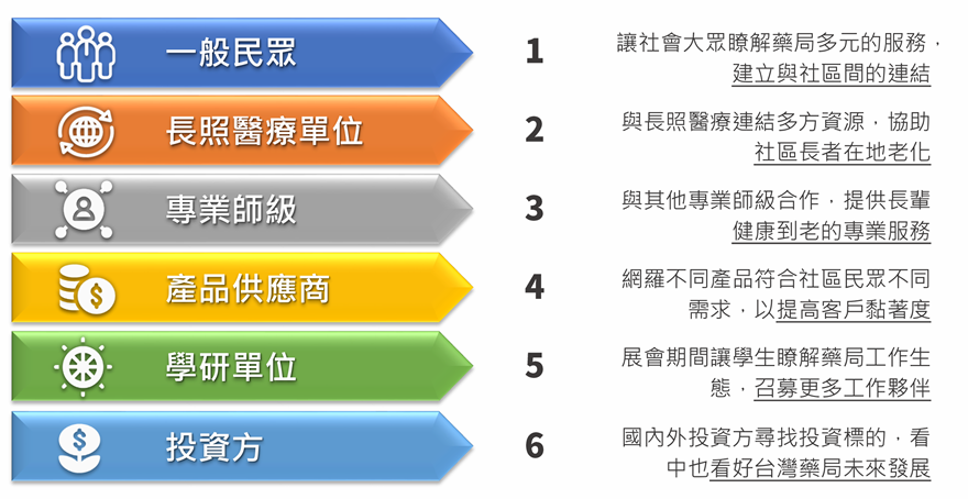 藥局型態正在加速轉型,藥局間的併購、異業結盟逐步展開,並已串接長照及社區鄰里照顧服務。擁有全台最大通路群的藥局,是滿足超高齡社會的需求、打造成為社區健康管理中心的最佳體系!為此,Cares Expo 第六屆台北國際照顧博覽會將攜手藥師公會,舉辦全國唯一【藥局保健展】,從加值藥局服務與滿足超高齡社會的需求,打造新型態藥局成為社區健康管理中心,達到在地老化之目標。