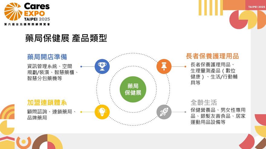 Cares Expo 第六屆台北國際照顧博覽會將攜手藥師公會,舉辦全國唯一【藥局保健展】,從加值藥局服務與滿足超高齡社會的需求,打造新型態藥局成為社區健康管理中心,達到在地老化之目標。