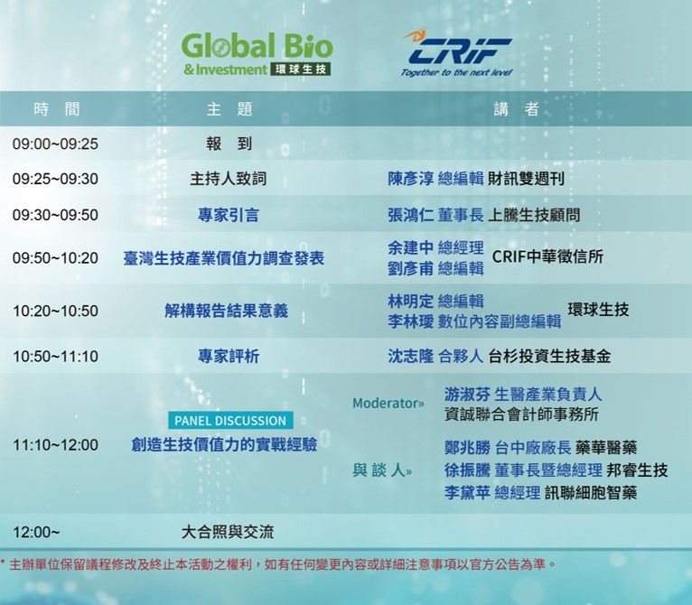 - 主辦單位:環球生技多媒體、CRIF TAIWAN 中華徵信所