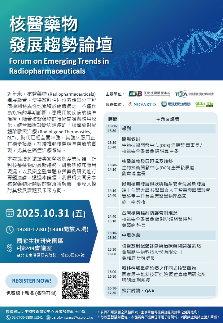 近年來,核醫藥物(Radiopharmaceuticals) 進展顯著,使得放射性同位素藉由分子靶向機制特異性地累積於組織病灶,不僅作為疾病的早期診斷,更應用於疾病的精準治療。隨著核醫藥物的技術開發與應用深化,結合腫瘤診斷與治療的「核醫放射配體診斷與治療 (Radioligand Theranostics, RLT)」時代已經全面來臨,其臨床應用正在穩步拓展,持續推動核醫精準醫療的實現,尤其在癌症治療領域。本次論壇將邀請專家學者與產業先進,針對核醫藥物的最新趨勢、研發與臨床應用現況,以及安全監管體系與案例研究進行專題演講。透過本論壇,我們將共同分享核醫藥物所開啟的醫療新契機,並深入探討其發展課題及未來方向。