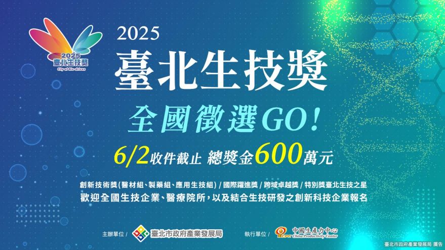 「臺北生技獎」自2004年開辦,為目前唯一由政府主辦、免報名費且總獎金最高,專屬生技產業的競賽,透過公平、嚴謹的審查機制與專業的審查團隊,成功徵選出全國近300件績優生技標的,頒發總獎金近1.2億元,榮耀光環成為企業形象加值最佳利器!