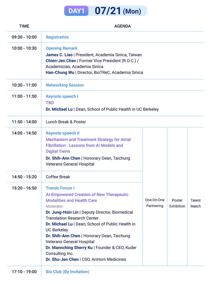 全台最具國際視野的生醫創新盛會,7/21–7/22兩天,帶你一次看盡台灣生醫新創的力量與潛力!今年DEMO DAY首度納入亞洲生技大會(BioAsia-Taiwan)系列活動,邀請來自 UC Berkeley 的公衛學院院長呂淳祺教授登台演講,並由中央研究院院士、前副總統 陳建仁 親自引言,深入對談全球健康挑戰與台灣機會。