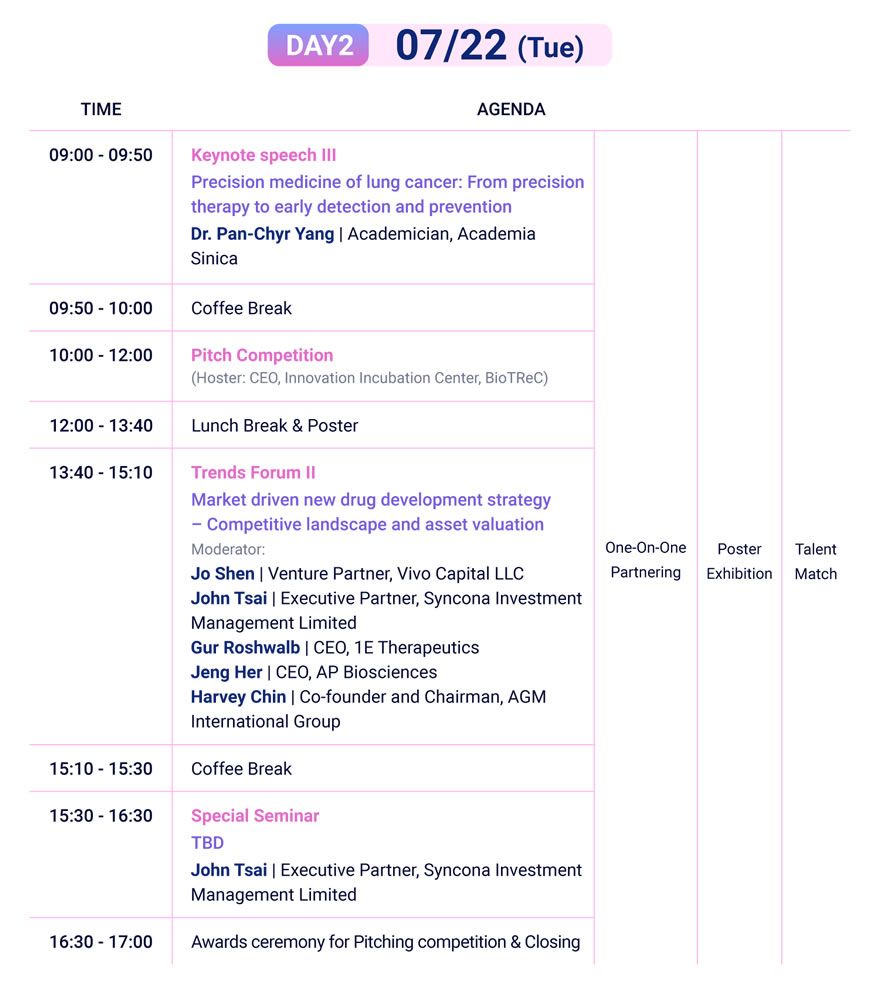 中央研究院生醫轉譯研究中心針對生醫新創公司需具備三大要素,技術、資金和人才,舉辦第五屆國家生技研究園區「招商暨人才與技術媒合會 (DEMO DAY)」,特別邀請美國加州大學柏克萊分校(UC Berkeley)公共衛生學院呂淳祺院長、楊泮池院士(中研院院士)及陳適安名譽院長(臺中榮民總醫院),以專題演講分享新知及寶貴經驗。趨勢論壇則邀請 1E Therapeutics 的 Gur Roshwalb 執行長、Syncona Limited 蔡正華合夥人及美國維梧資本投資公司創業合夥人馬海怡博士及顧德顧問公司顧曼芹總經理、圓祥生技何正宏總經理、安宏生醫陳淑貞科學長及AGM靳嚴博董事長等國內外產官學研之專家一同與談交流,凝聚重要領袖之真知灼見,激發各方互動與潛能之火花。