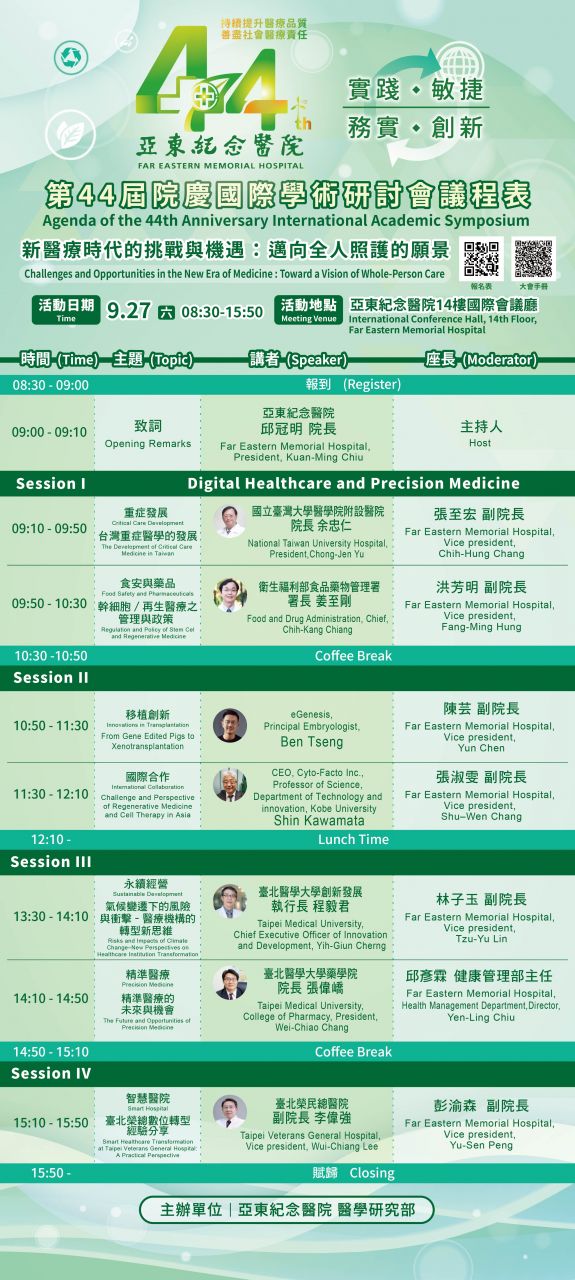 一、亞東紀念醫院迎來四十四週年院慶,本屆國際研討會旨在引領與會者深入探討智慧醫療、精準健康與高齡照護等領域的最新趨勢與臨床應用。透過醫療、學術及產業間的跨域交流與對話,期能拓展多方合作的契機。隨著疾病型態與社會需求不斷變遷,全人醫療與以病人為中心的照護模式已成為全球醫學發展的核心方向。本次會議期望凝聚專業共識,激盪創新思維,進一步提升整體照護品質,推動健康永續的社會藍圖,同時彰顯亞東紀念醫院於國際醫學舞台上的學術實力與發展潛能。