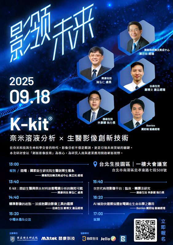 本研討會由 國家衛生研究院 與 閎康科技 主辦,並聯合伯森生技、捷絡生技、Borries 共同協辦,聚焦於 K-kit 奈米液態電鏡、生醫影像平台及 AI 輔助分析 等前沿技術,從研究探索到臨床應用的完整解決方案,帶您掌握跨領域影像技術的最新進展,並洞見其在精準醫療、生命科學研究及產業轉譯上的無限可能。