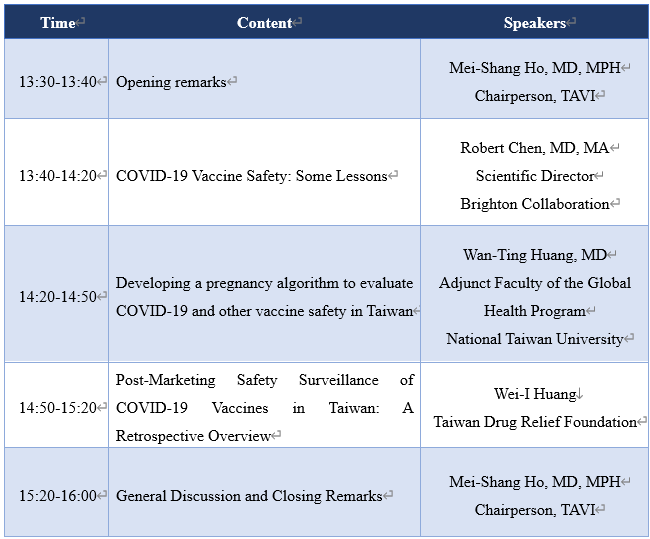 本研討會將探討新冠疫苗在真實世界的安全性與有效性,邀請國內外專家分享疫苗安全性監測的最新經驗、孕婦疫苗安全性評估,以及台灣真實世界疫苗數據,現場也將安排交流與討論時段,讓與會者有機會進行相關領域的交流。