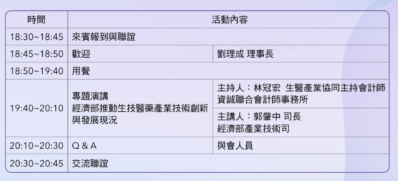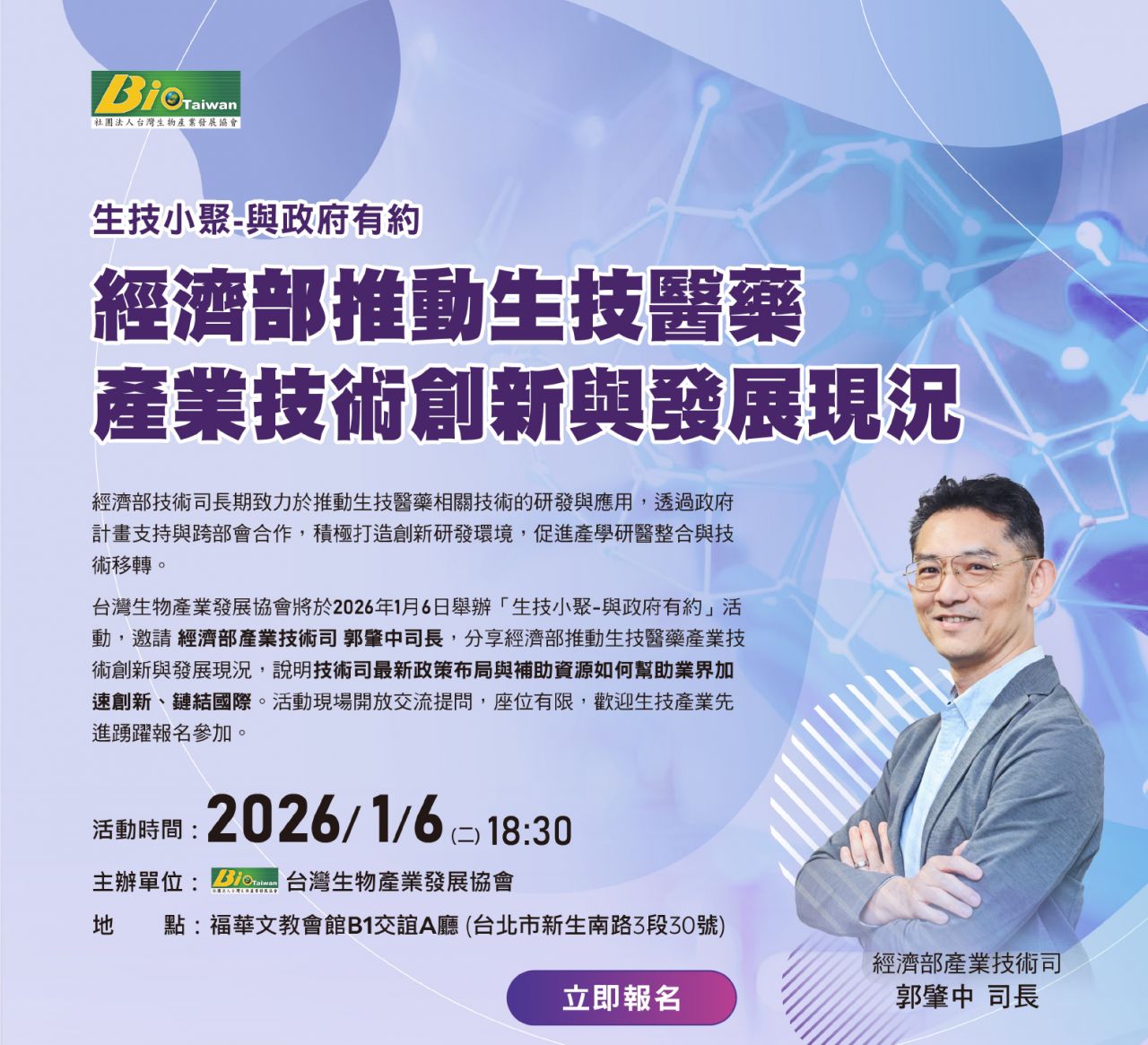 新春第一場「生技小聚-與政府有約」將於2026/01/06(二) 舉行,邀請到 經濟部產業技術司 郭肇中司長 以「經濟部推動生技醫藥產業技術創新與發展現況」為題演講,分享技術司最新政策布局與補助資源如何幫助業界加速創新、鏈結國際。