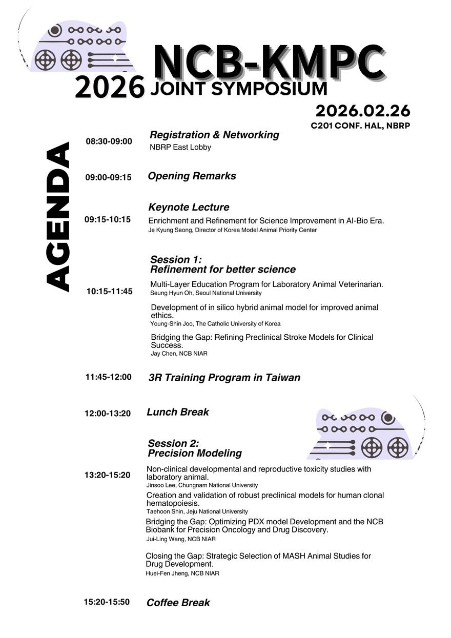 國研院國家生物模式中心(本中心)與TCLAM及韓國Korea Model animal Priority Center (KMPC)預計於2/26(四) 8:30-16:00召開【2026 NCB-KMPC JOINT SYMPOSIUM】台韓實驗動物交流研討會,隨著國際社會對實驗動物福祉之重視持續提升,臨床前研究亦面臨重新檢視傳統動物模式之必要性。如何突破既有模式限制,透過優化、創新及新興科技導入,已成為重要研究方向。
