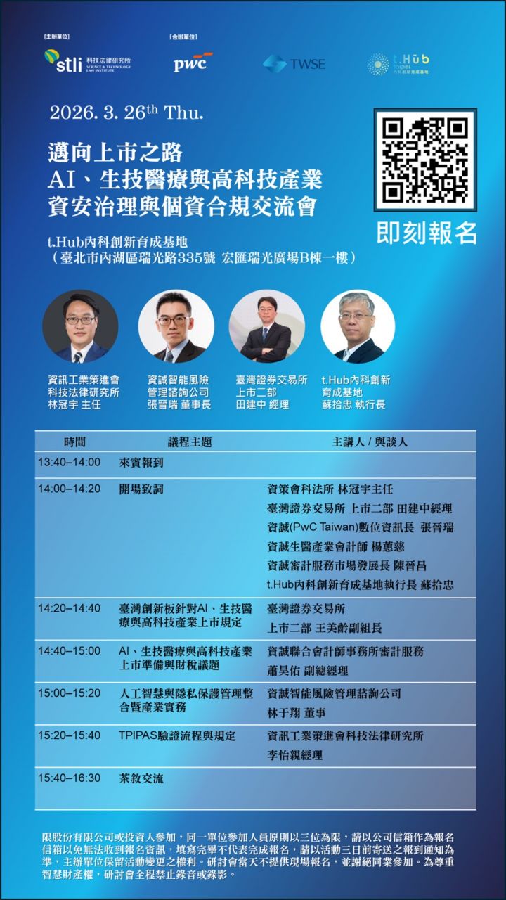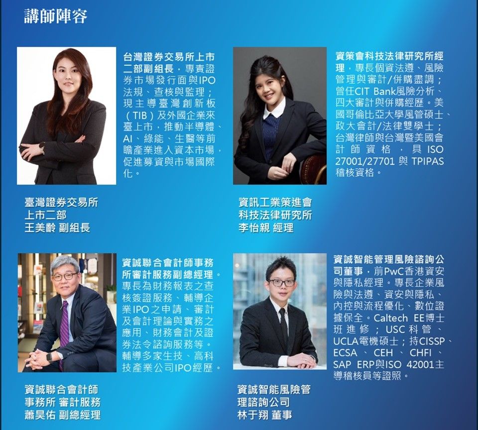特別邀請臺灣證券交易所介紹臺灣創新板上市規定,並由資策會與資誠專家分享上市趨勢、敏感資料治理與驗證經驗。並進一步透過實務案例探討,解析PIMS導入流程、資料盤點與風險評估方法,說明TPIPAS申請與測試重點,並剖析上市ESG與隱私合規的連動。邀集AI、生技醫療與高科技產業(包括半導體、數位雲端)對資安與法遵有興趣的貴賓參加。