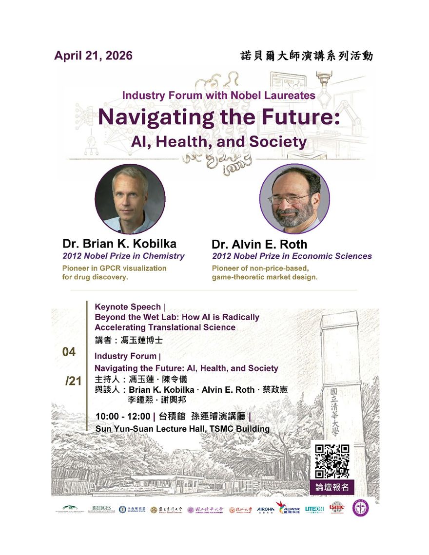 4月21日清華生醫學院將舉辦兩位諾貝爾大師Brian Kobilka and Alvin Roth的對談,聚焦AI對藥物開發及市場機制的影響力,同場的與談者將進行一場跨科學、技術、經濟、社會與教育的對談,精彩可期,誠摯歡迎大家踴躍報名參與