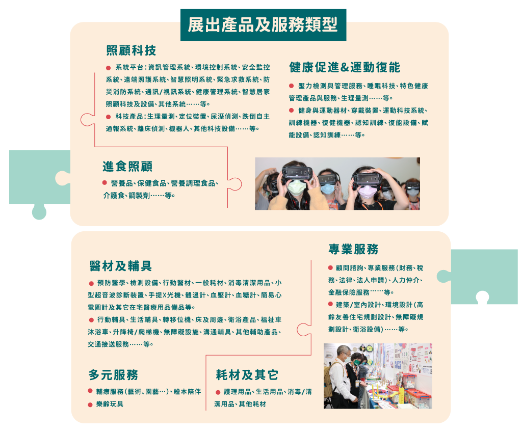 ► 跨域整合,集結最新設備與服務,展出類型涵蓋照顧科技、醫材輔具、健康樂活、進食照顧、高齡友善住宅、金融長照信託、照顧服務設計等