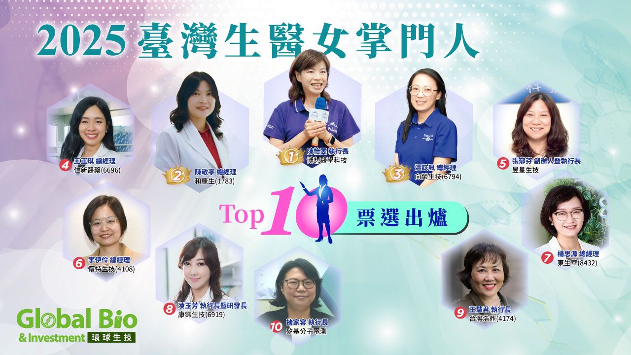 由《環球生技月刊》主辦、全台唯一聚焦女性生技醫藥產業領導者的票選活動——【2025臺灣生醫企業最佳女掌門人】最終結果出爐,前十名名單揭曉! 本次活動共有45位生醫女掌門人參選,獲得5.7萬總票數,由博想醫學陳怡雯執行長勇奪第一、和康生技陳敬亭總經理榮登第二、向榮生技洪懿珮總經理獲得第三名、仁新醫藥王正琪總經理獲得第四、昱星生技張郁芬執行長獲得第五、懷特生技李伊伶總經理獲得第...