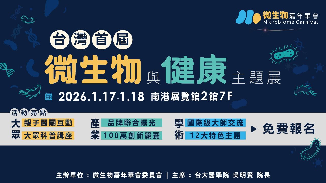 微生物正快速改變全球健康、農業與永續產業的版圖。為展現台灣在此領域十年累積的研究成果與完整產業鏈,2026微生物嘉年華會將於2026年1月17–18日在台北南港展覽館2館7樓盛大登場。本屆活動由台大醫學院吳明賢院長擔任大會主席,並以論壇十周年為契機,將「亞洲微生物體趨勢論壇」全面升級為嘉年華會。活動整合國際高峰論壇×科普互動展×產業展示平台×創新競賽...