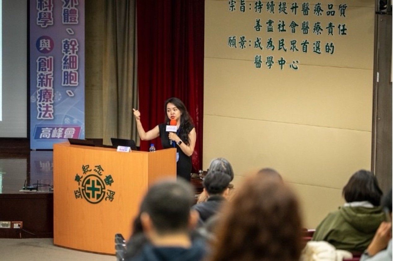馬偕醫學院沈家寧教授介紹來自誘導性多能幹細胞(iPSC)類器官的組織特異性胞外體,說明其在模擬人體疾病模型與治療應用上的優勢。他指出,這類技術有助於推動精準醫療與個人化治療的發展。