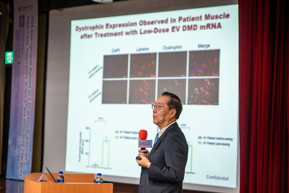 玉山學者李利教授介紹以胞外體RNA為核心的基因治療策略,說明胞外體在穩定傳遞核酸分子上的優勢。他進一步指出,這類技術在促進組織修復、調控發炎反應及再生醫學應用上,展現高度研究與臨床發展潛力。