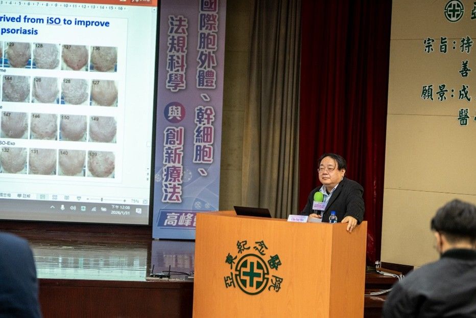 衛生福利部食品藥物管理署(TFDA)姜至剛署長分享臺灣在《再生醫療製劑管理條例》施行後,胞外體相關產品於研發與臨床應用上所面臨的法規挑戰與審查重點。他指出,透過科學證據導向的法規科學架構,將有助於在確保病人安全的前提下,支持創新療法的發展與落地。