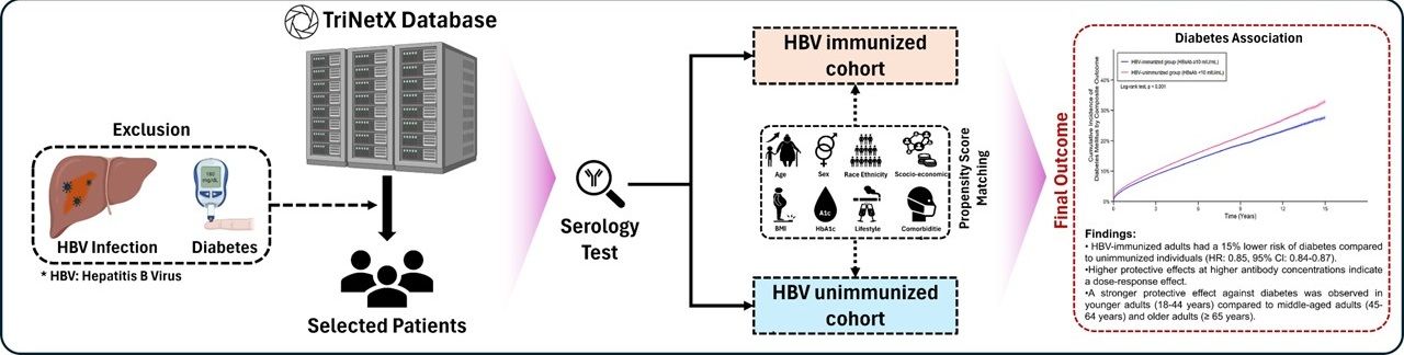北醫大研究團隊分析了全球152個國家、131個醫療機構近90萬名未罹患糖尿病也未曾感染過B型肝炎的成年人之醫療記錄,其中逾57萬人具有B型肝炎免疫力,31萬餘人不具免疫力。