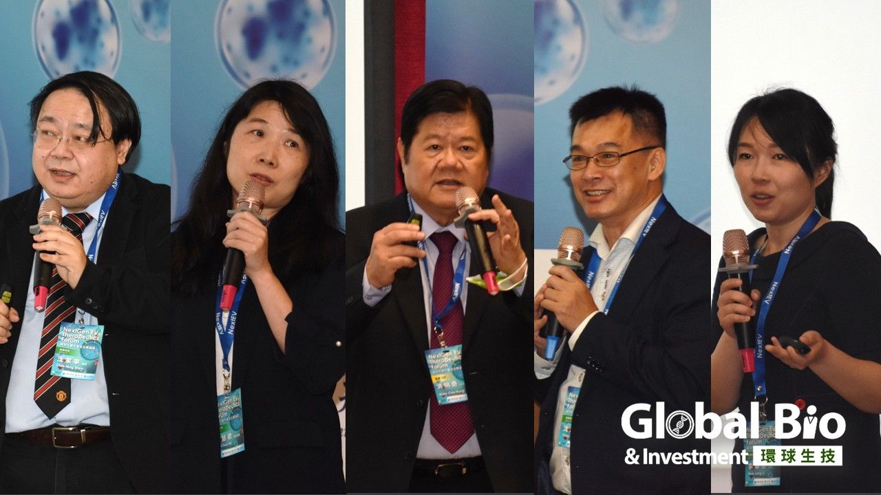 左起:中研院基因體研究中心研究員沈家寧、聖安生醫副總經理何慧君、中國醫藥大學校長洪明奇、臺灣大學植物病理與微生物學系教授沈湯龍、國衛院細胞及系統醫學研究所副研究員兼任副所長李華容。(攝影/吳培安)