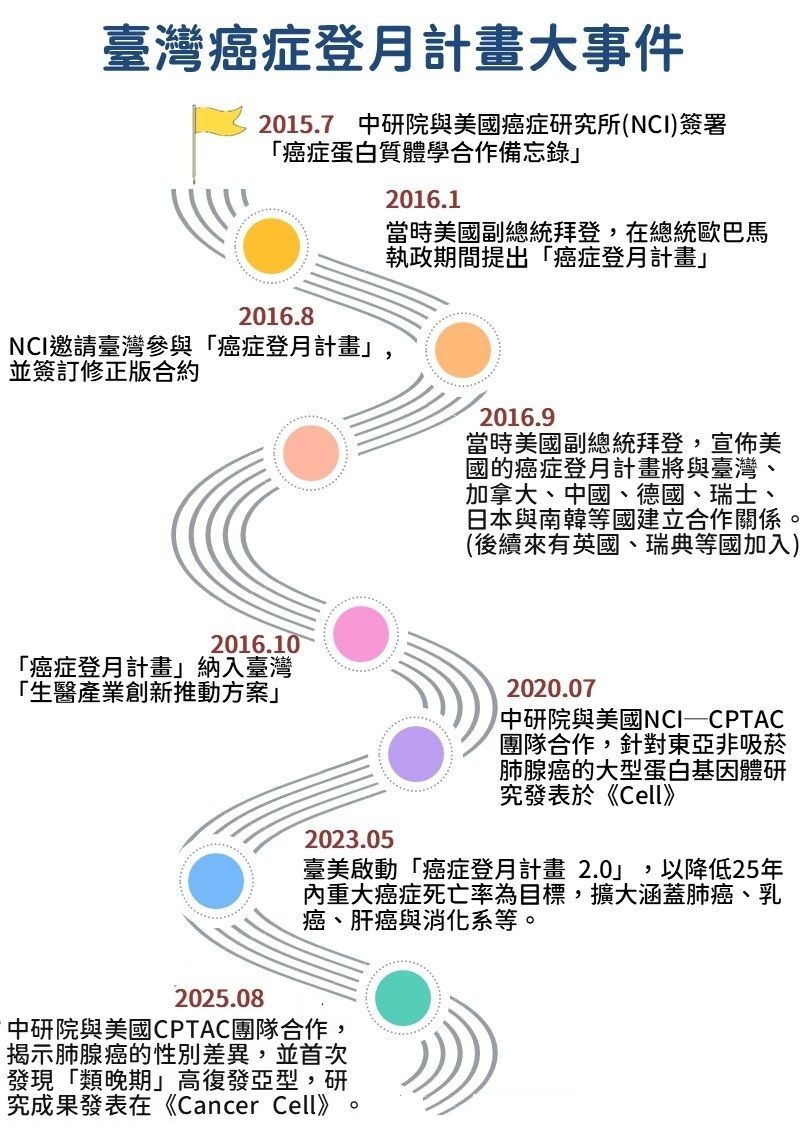 「臺灣癌症登月計畫」自啟動以來已有多項代表性成果,包括:2020年與美國NCI及美國臨床蛋白基因體學腫瘤分析聯盟(CPTAC)團隊合作,針對東亞非吸菸肺腺癌的大型蛋白基因體研究發表於《Cell》,並登上封面;今年更在《Cancer Cell》揭示肺腺癌的性別差異,並首次發現「類晚期」高復發亞型。