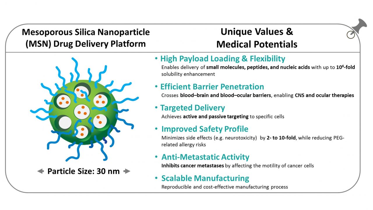奈力生醫專注開發以「中孔洞二氧化矽奈米粒子(MSN)」為核心的創新藥物傳輸平台技術,針對中樞神經、視網膜疾病、腦癌、高轉移性癌症及基因療法等因藥物傳輸困難而缺乏有效治療的疾病,提供具突破性的奈米藥物治療方案。