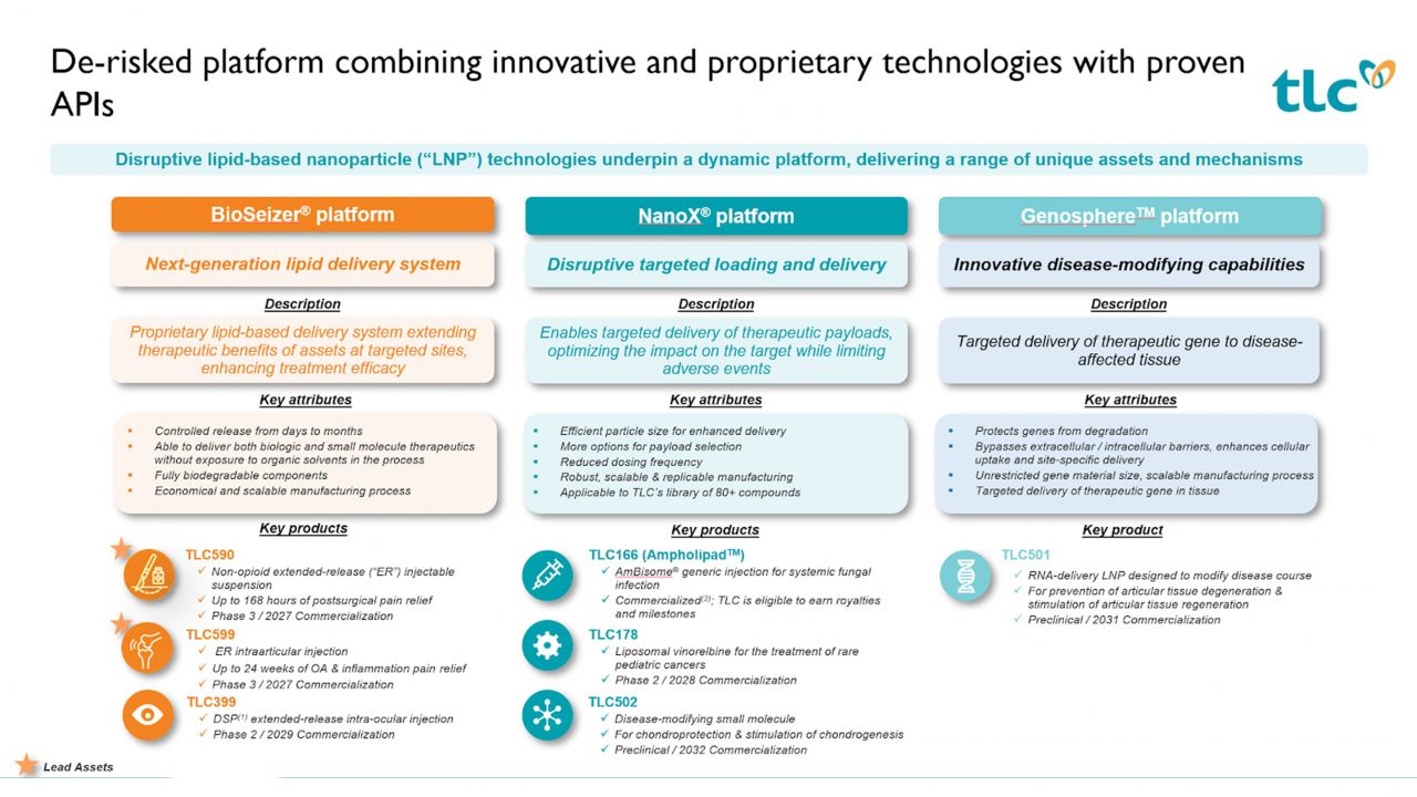 TLC擁有全球超過400項專利,並完成多項符合美國FDA與台灣TFDA法規的臨床試驗。目前擁有兩項後期臨床階段的研發計畫:TLC599(用於骨關節炎之疼痛)與TLC590(用於術後疼痛控制),預計皆於2027年前在美國取得核准。