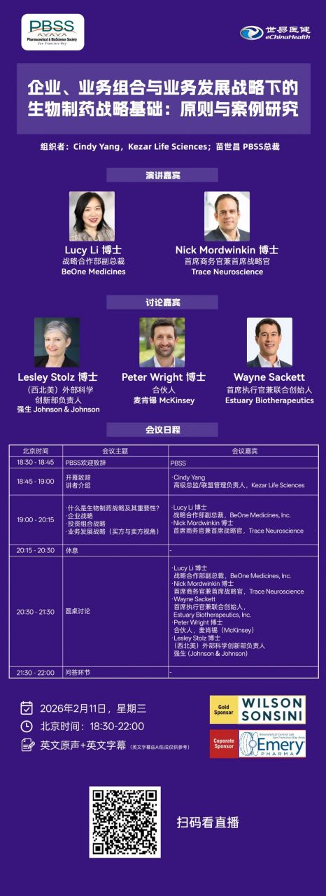 2026年2月11日18:30,由國際醫藥與生物科學學會(PBSS)主辦,美國威爾遜律師事務所贊助、Emery Pharma聯合贊助舉辦的「企業、業務組合與業務發展戰略下的生物製藥戰略基礎:原則與案例研究」研討會,將於線上開啟。