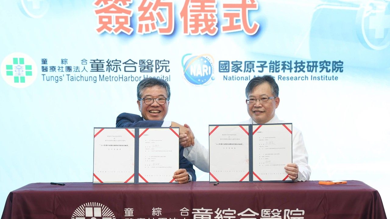 昨(1)日,童綜合醫院攜手國家原子能科技研究院共同執行「人工智慧於核醫診療藥物開發臨床驗證」及未來相關合作,雙方簽署合作意願書,由國家原子能科技研究院高梓木院長與童綜合醫院童敏哲董事長暨總院長代表簽約,一起強化推動核醫新藥物的研發,提升疾病治療的成效,並讓更多患者獲得更精準的治療。簽約儀式現場由童綜合醫院童童敏哲董事長暨總院長、研發創新中心歐宴泉院長、李博仁副院長、研發創新中心蘇大成副院長、核子醫...