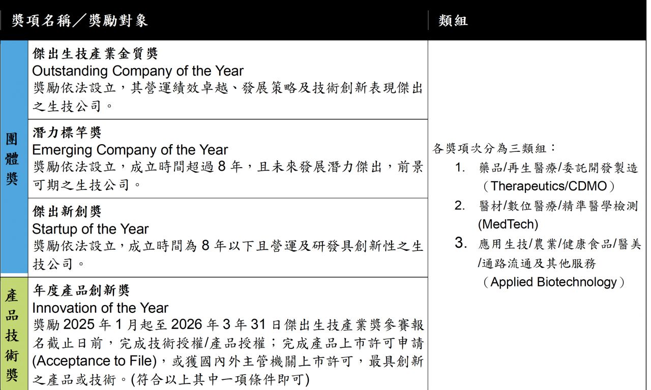 ※2026傑出生技產業獎 Taiwan BIO Awards徵獎類別: