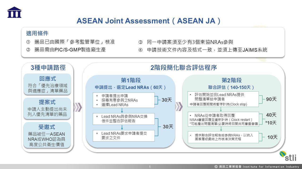 根據2024年修訂最新版本的「東協藥品聯合評估程序申請人須知」 (ASEAN Joint Assessment Procedure for Pharmaceutical Products Information for applicants),ASEAN JA適用條件、申請路徑及評估流程整理如下。
